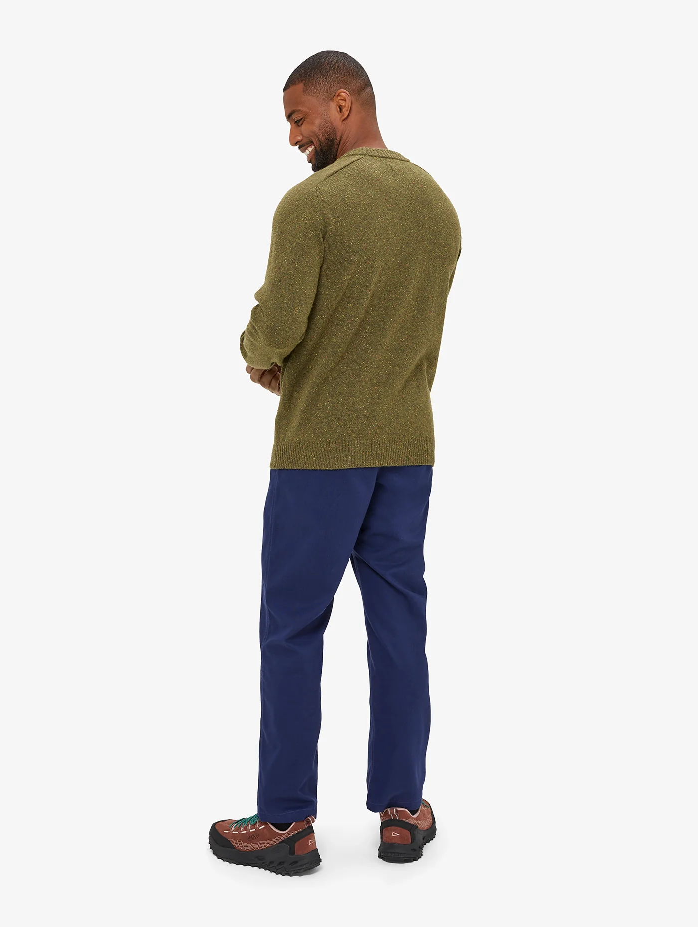 Knitted crew neck sweater in a durable flecked yarn.